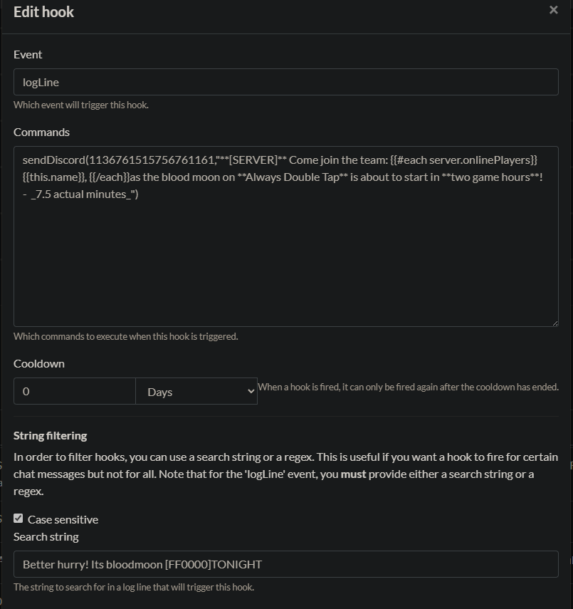 sendDiscord(1273925999494434868,"**[SERVER]** Come join the team: {{#each server.onlinePlayers}}{{this.name}}, {{/each}}as the blood moon on **Diamond** is about to start in **two game hours**! - _5 actual minutes_")to announce the blood moon but it didnt seem to work. It is set as a custom hook with LogLine as i had seen someone else using this command i thought this would work