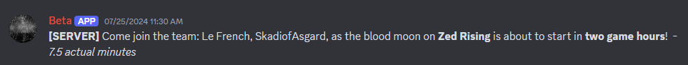 sendDiscord(1136761515756761161,"**[SERVER]** Come join the team: {{#each server.onlinePlayers}}{{this.name}}, {{/each}}as the blood moon on **Zed Rising** is about to start in **two game hours**! - _7.5 actual minutes_")Search String: Better hurry! Its bloodmoon TONIGHT